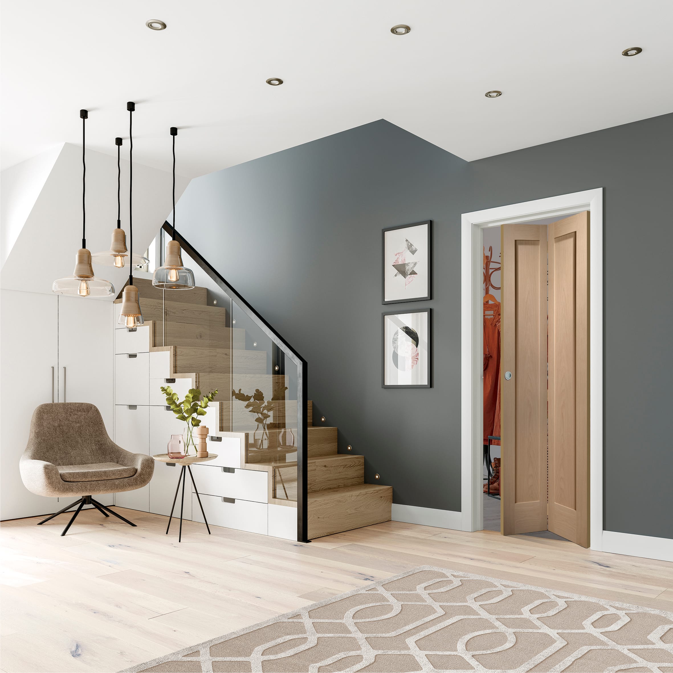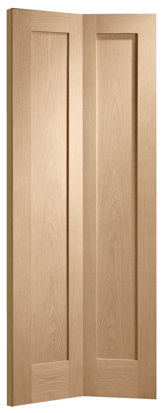 A flexible unfinished bi-fold oak door., A flexible unfinished bi-fold oak door., A flexible unfinished bi-fold oak door.