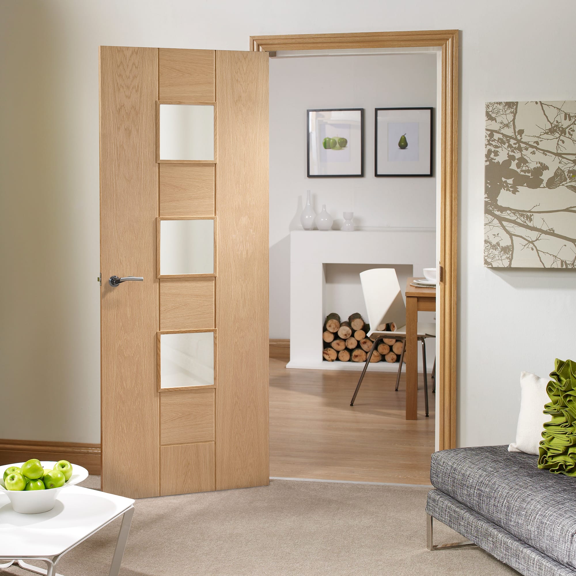 Internal Oa Pre-Finished Messina with Clear Glass, A contemporary fully finished oak door combining horizontal and vertical grain panels along with Clear Glazed panels., A contemporary fully finished oak door combining horizontal and vertical grain panels along with Clear Glazed panels.