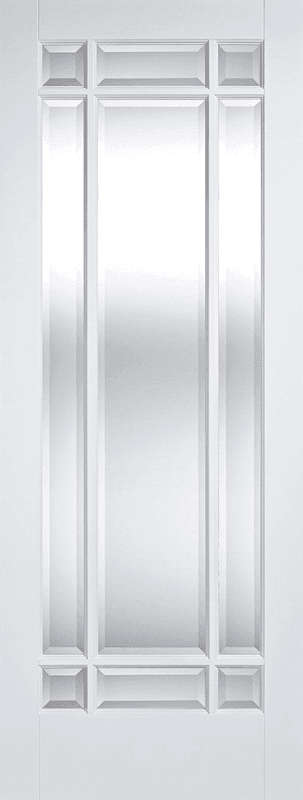 Manhattan 9L Primed White Doors 686 mm x 1981 mm, Manhattan 9L Primed White Doors 762 mm x 1981 mm, Manhattan 9L Primed White Doors 838 mm x 1981 mm. The practical Manhattan door design features clear bevelled glazed panels with decorative bars and is finished in a white shade